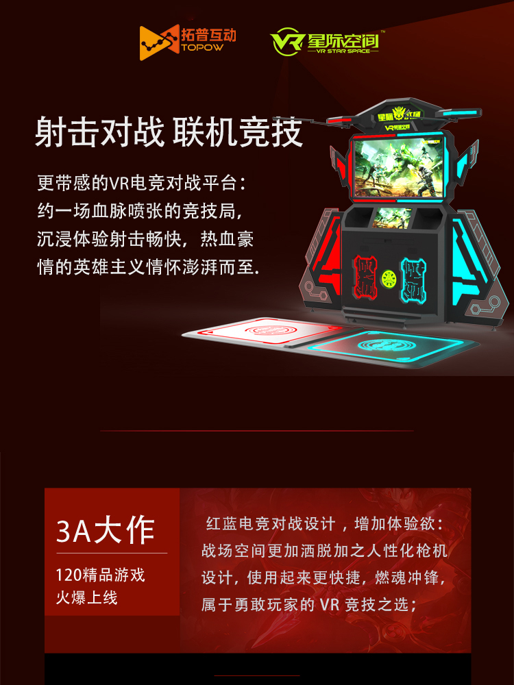 紅藍(lán)電競對抗色設(shè)計,增加體驗欲:開放式戰(zhàn)場空間設(shè)計,正面對抗,燃魂沖鋒,屬于勇敢者的VR游戲體驗之選;
